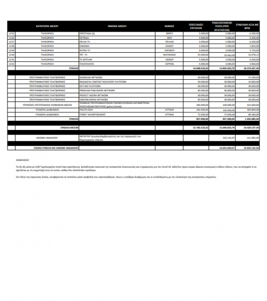 Δείτε στο λινκ που ακολουθεί τη λίστα με τα ΜΜΕ και τα ποσά που δόθηκαν σχετικά με την καμπάνια για τον κορωνοϊό: ΚΑΤΑΛΟΓΟΣ-ΜΕΣΩΝ_ΕΚΣΤΡΑΤΕΙΑ-ΕΝΗΜΕΡΩΣΗΣ-COVID_19-1.