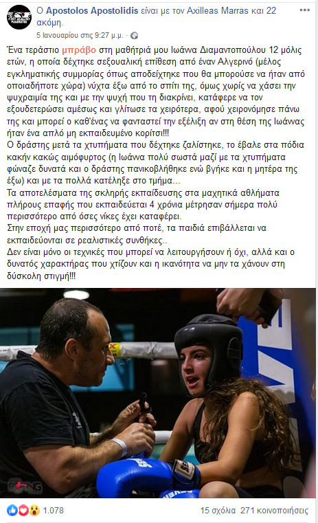 Ένα τεράστιο μπράβο στη μαθήτριά μου Ιωάννα Διαμαντοπούλου 12 μόλις ετών, η οποία δέχτηκε σεξουαλική επίθεση από έναν Αλγερινό (μέλος εγκληματικής συμμορίας όπως αποδείχτηκε που θα μπορούσε να ήταν από οποιαδήποτε χώρα) νύχτα έξω από το σπίτι της, όμως χωρίς να χάσει την ψυχραιμία της και με την ψυχή που τη διακρίνει, κατάφερε να τον εξουδετερώσει αμέσως και γλίτωσε τα χειρότερα, αφού χειρονόμησε πάνω της και μπορεί ο καθένας να φανταστεί την εξέλιξη αν στη θέση της Ιωάννας ήταν ένα απλό μη εκπαιδευμένο κορίτσι!!!