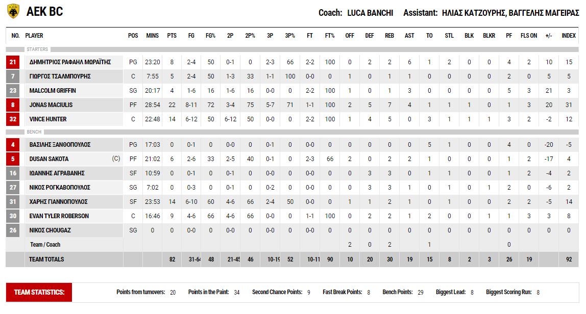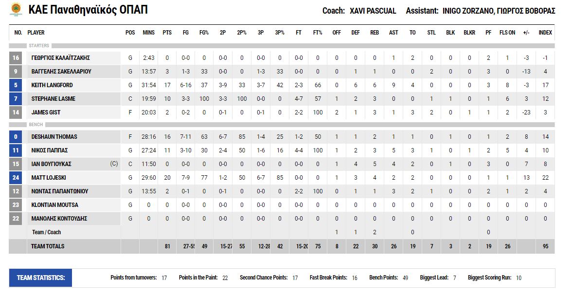 Οι «πράσινοι» είχαν 7/11 δίποντα και 7/18 τρίποντα, 16ριμπάουντ και 15 ασιστ, ενώ η «Ένωση» είχε 11/20 δίπ, 5/10 τρίπ και 12 ριμπάουντ