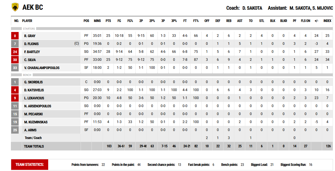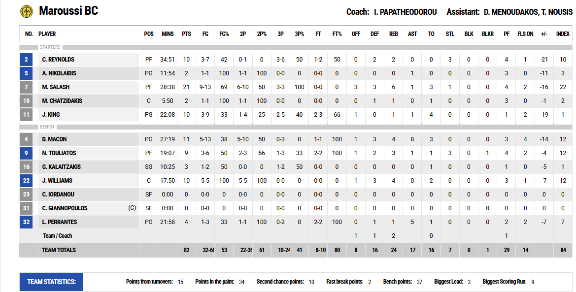 Όλα τα λεφτά για την ομάδα του Ντράγκαν Σάκοτα ήταν η τριάδα των Μπάρτλεϊ, Γκρέι και Σίλβα που έβαλαν συνολικά 78 πόντους! Στους 28 σταμάτησε ο πρώτος, που είχε και 7 ασίστ, ενώ από 25 πόντους είχαν οι άλλοι δύο. Για το Μαρούσι ξεχώρισε ο Σάλας με 21 πόντους και 6 ριμπάουντ ενώ ο πρώην «κιτρινόμαυρος» Μέικον είχε 11 πόντους με 4 ριμπάουντ και 8 ασίστ.
