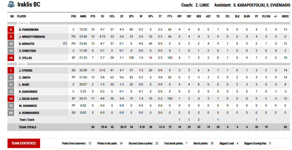 Η ομάδα του Βαγγέλης Ζιάγκου βρήκε λύσεις στην τέταρτη περίοδο, όταν ο Ηρακλής γύρισε το παιχνίδι και πήρε προβάδισμα στο σκορ. Για τους νικητές ο Μπριγκς είχε 15 πόντους και 7 ριμπάουντ, ο Κάναντι 16 πόντους, ο Ρέι 17 πόντους και 7 ριμπάουντ και ο Άπλμπι 15 πόντους. Ο Σμιθ με 15 πόντους ήταν ο κορυφαίους για τον Ηρακλή που είχα ακόμη τον Φάντεμπεργκ με 10 πόντους, 8 ριμπάουντ, τον Μωραΐτη με 12 πόντους και τον Ράιτ Φόρμαν με 12 πόντους αλλά με 9 λάθη και 4/12 σουτ.