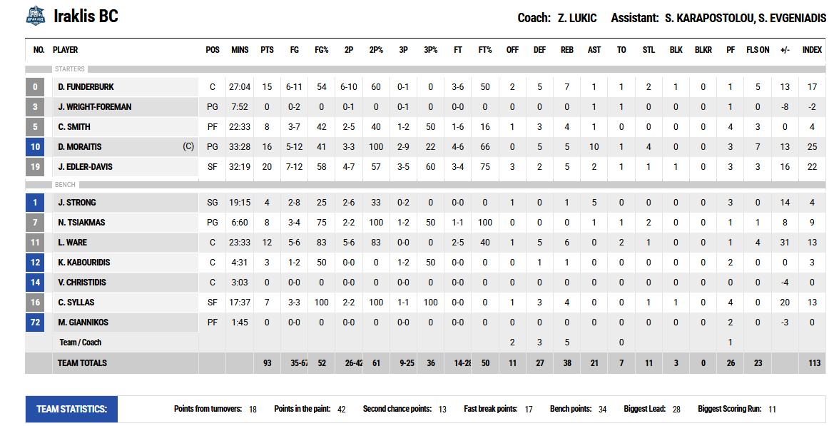 Κορυφαίος στην επικράτησή του ήταν ο Δημήτρης Μωραΐτης, ο οποίος τελείωσε το παιχνίδι με νταμπλ -νταμπλ (16 πόντοι, 10 ασίστ). Το έργο του Έλληνα γκαρντ στήριξαν, περισσότερο, οι Τζάστιν Έντλερ-Ντέιβις (20 πόντοι, 5 ριμπάουντ, 2 ασίστ), Ντι Τζέι Φάντερμπερκ (15 πόντοι, 7 ριμπάουντ, 2 κλεψίματα, 1 κόψιμο).