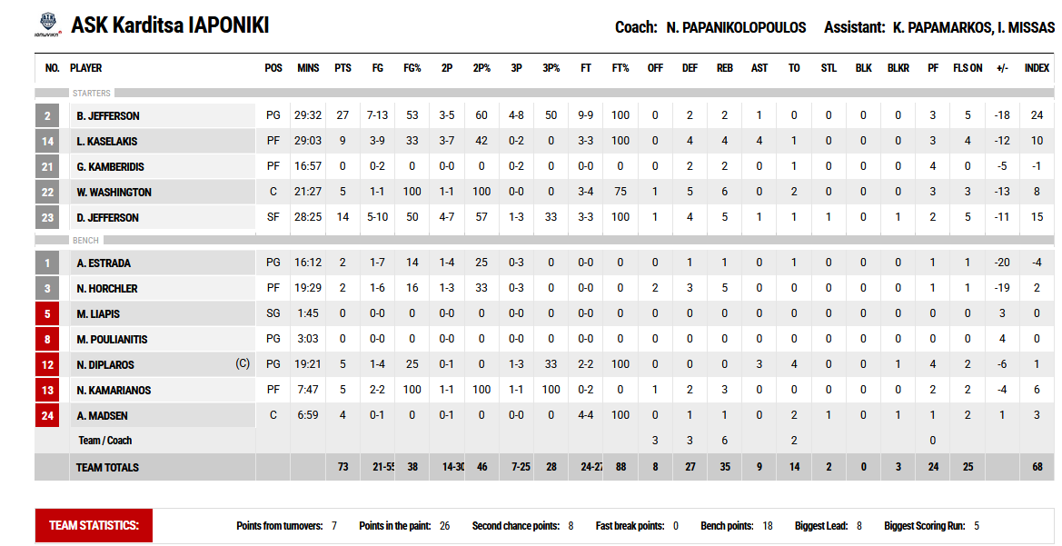 Χρόνο συμμετοχής πήραν και οι Νίκος Τσιακμάς (8 πόντοι, 1 ασίστ, 2 κλεψίματα), Τζον Σίλας (7 πόντοι, 4 ριμπάουντ, 1 κλέψιμο, 1 κόψιμο), επιστρέφοντας αμφότεροι σε δράση για τον «Γηραιό» μετά τους τραυματισμούς τους. Έκτη συνεχή ήττα για την Καρδίτσα, η οποία «χάθηκε» στο παρκέ, μετά το πρώτο ημίχρονο. Πρώτος σκόρερ για λογαριασμό της ήταν ο Μπράντον Τζέφερσον (27 πόντοι, με 9/9 βολές, 4/8 τρίποντα).