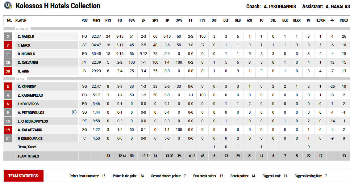 Οι φιλοξενούμενοι δεν παράτησαν το παιχνίδι και μείωσαν στον πόντο με καλάθι του Νίκολς (54-53, 24′), με την Ένωση να έχει και πάλι τις λύσεις (71-64, 30′). Με τον Νίκολς και πάλι ο Κολοσσός μείωσε σε 76-75 (34′), αλλά αυτή ήταν και η τελευταία φορά που πλησίασε. Φλιώνης, Γκρέι και Νάναλι με ισάριθμα τρίποντα εκτόξευσαν το σκορ στο 89-77 (38′) και η ΑΕΚ πήρε τη νίκη με 96-83.
