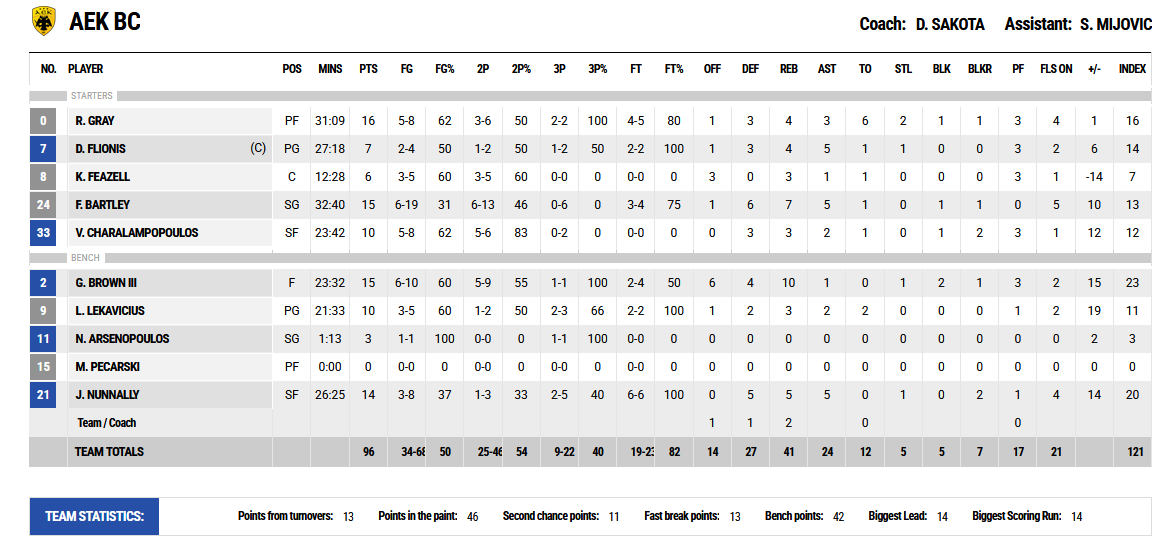Η ομάδα του Ντράγκαν Σάκοτα είχε έξι παίκτες με διψήφιο αριθμό πόντων και τον Γκρέι πρώτο σκόρερ με 16 πόντους. Πρώτη καλή εμφάνιση για τον Νάναλι με 14 πόντους, 5 ριμπάουντ και 5 ασίστ. Για το σύνολο του Άρη Λυκογιάννη, ο Ραντλ ξεχώρισε με 24 πόντους.