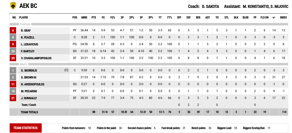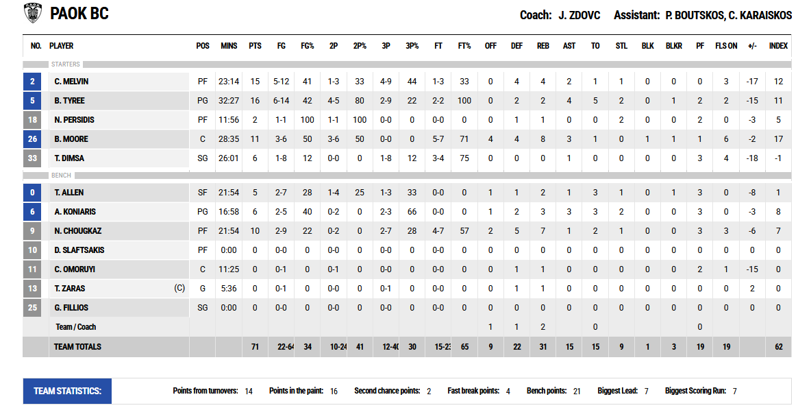 Αυτή ήταν η δωδέκατη σερί νίκη για την Ένωση σε όλες τις διοργανώσεις, με τον Νάναλι να είναι και πάλι ο κορυφαίος. Ο Αμερικανός γκαρντ είχε 22 πόντους με 3 ριμπάουντ και 3 ασίστ ενώ ο πρώην «ασπρόμαυρος» Μπάρτλεϊ σταμάτησε στους 18 πόντους με 5 ριμπάουντ και 4 ασίστ. Για τον ΠΑΟΚ ο Ταϊρί είχε 16 πόντους και ο Μέλβιν 15.