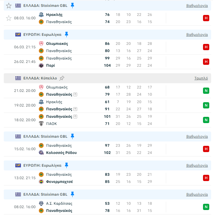 Στο 15-4 και τη δεύτερη θέση του ελληνικού πρωταθλήματος παραμένει ο Παναθηναϊκός και στα της Euroleague είναι στο 16-14 και τη 10η θέση και κάνει αγώνα δρόμου για να προλάβει το… τρένο των playoffs.