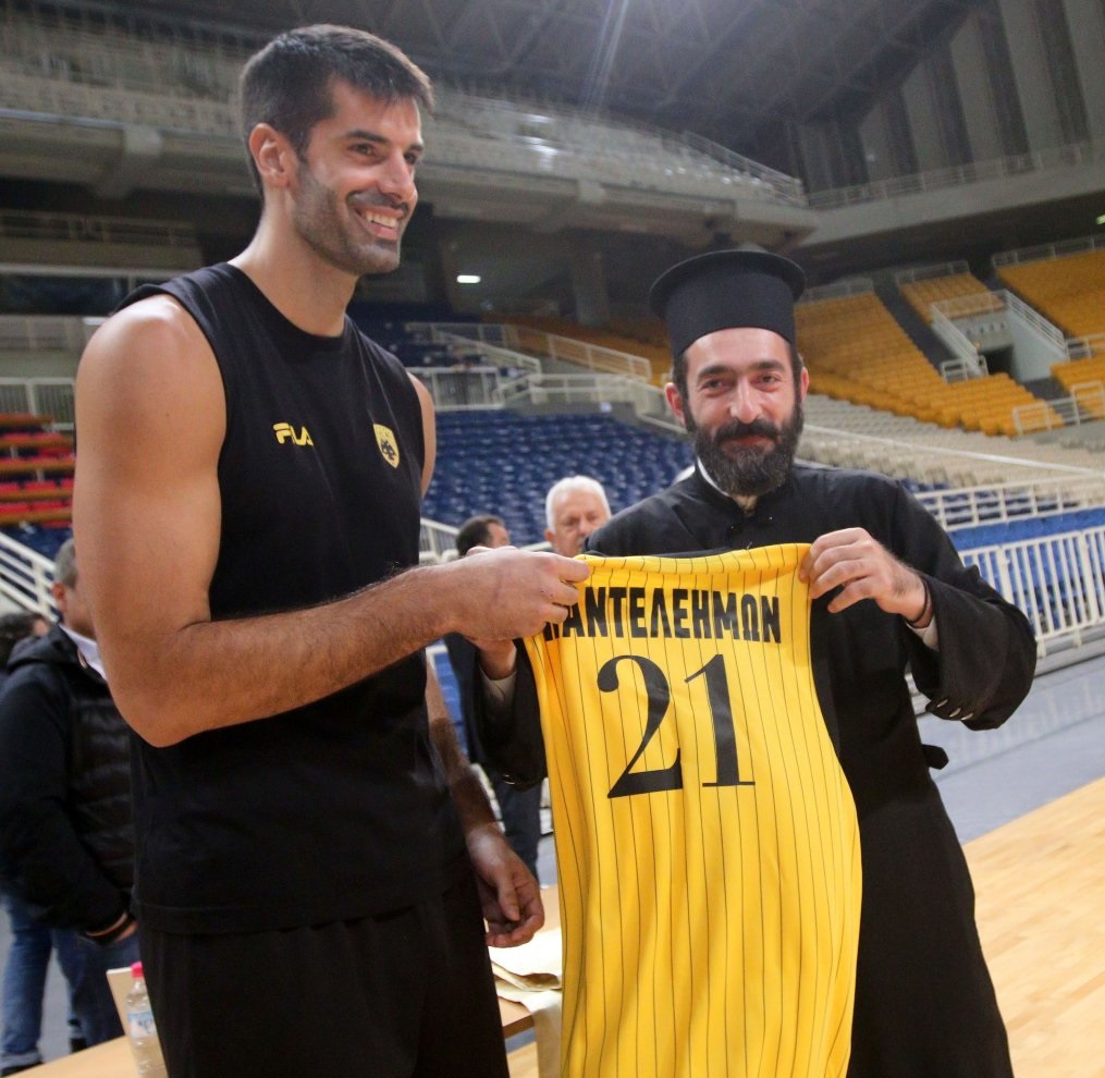 Τον αγιασμό τέλεσε ο Αρχιμανδρίτης Παντελεήμονας, με τους ανθρώπους της ΑΕΚ να του χαρίζουν μία φανέλα, στην οποία αναγραφόταν το όνομά του και ο αριθμός 21. Η φανέλα παραδόθηκε δια χειρός του αρχηγού της Kυπελλούχου Ελλάδας και κατόχου του Basketball Champions League, Ντούσαν Σάκοτα.