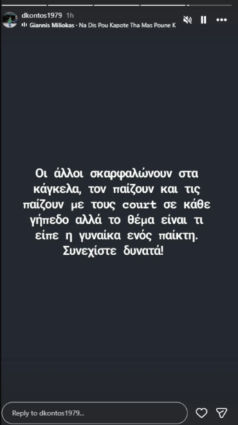«Οι άλλοι σκαρφαλώνουν στα κάγκελα, τον παίζουν και τις παίζουν με τους court σε κάθε γήπεδο, αλλά το θέμα είναι τι είπε η γυναίκα ενός παίκτη. Συνεχίστε δυνατά!».