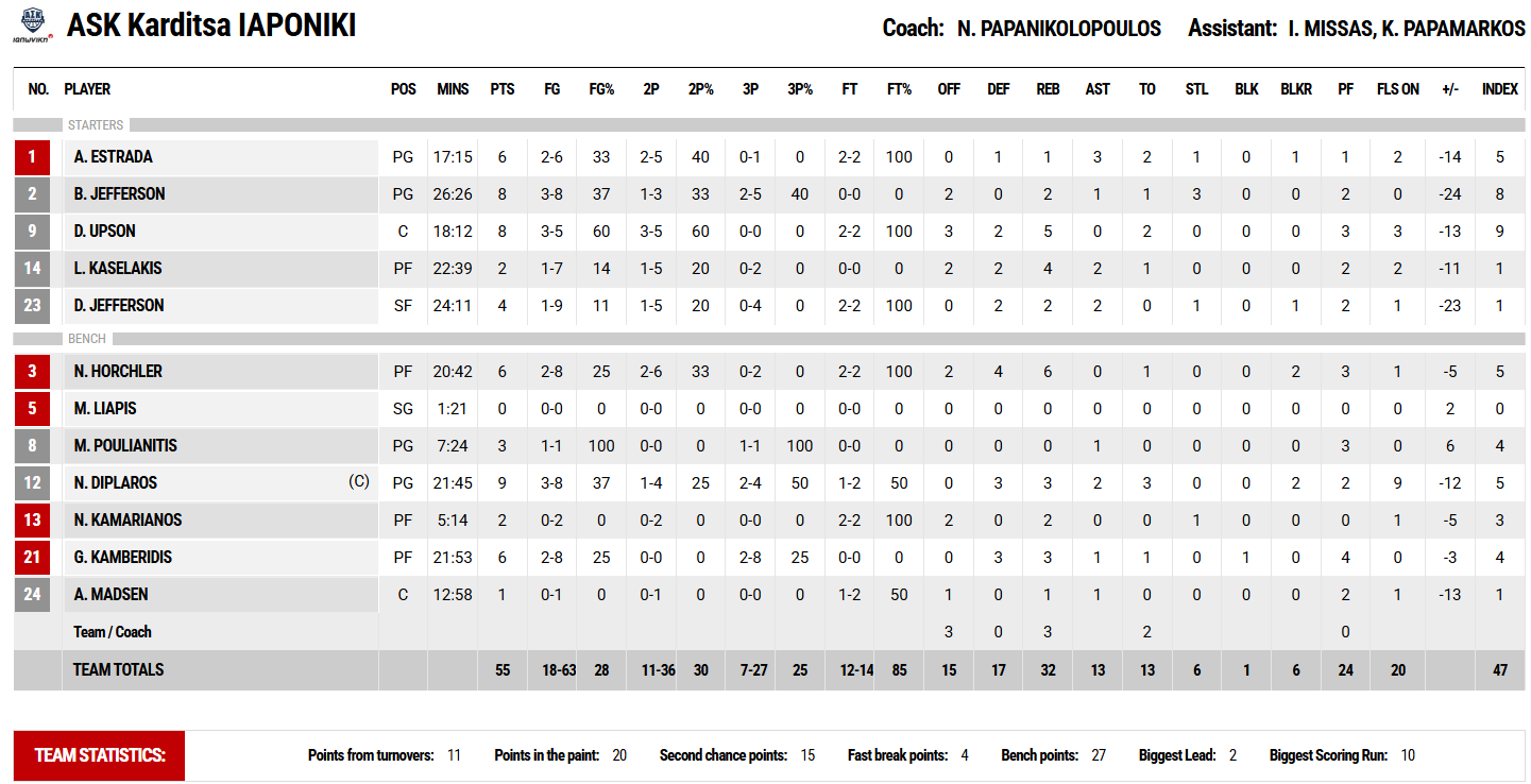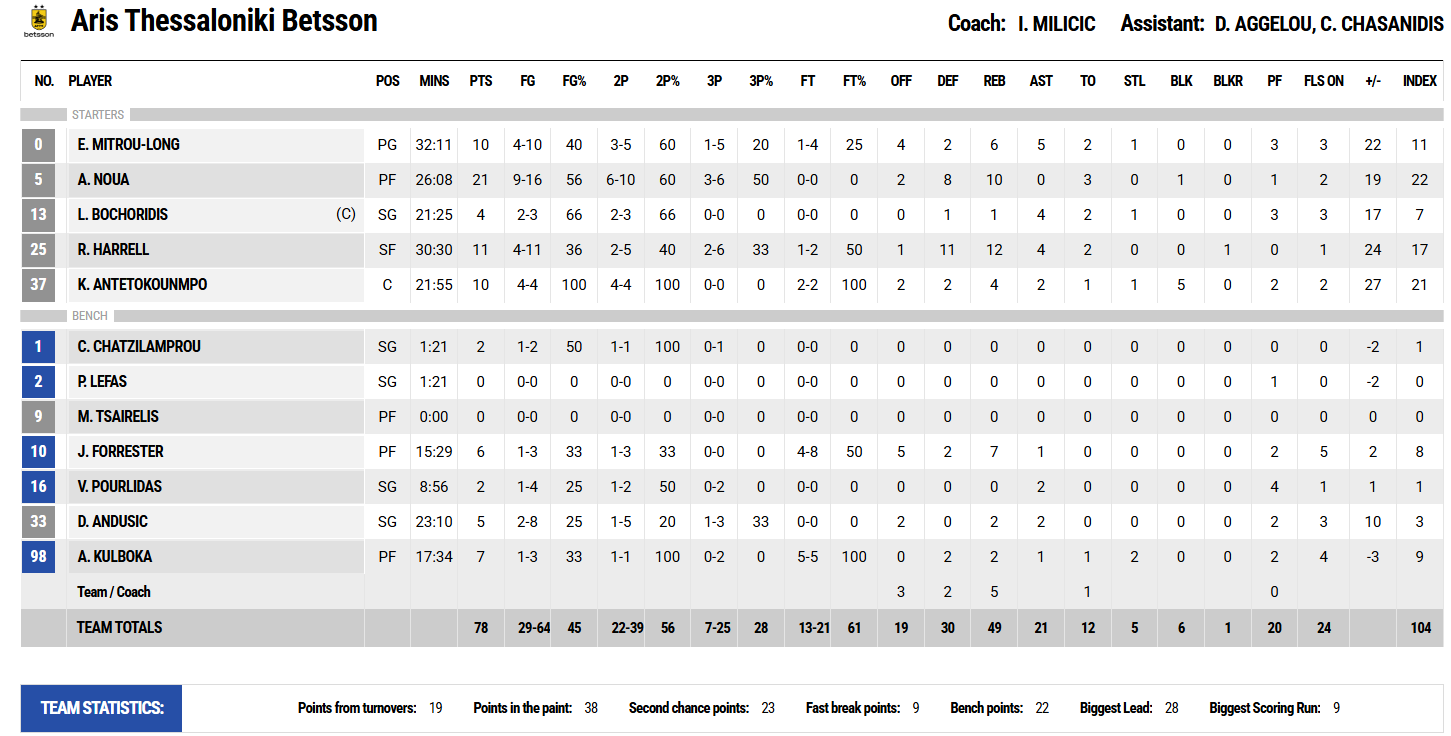 Κορυφαίος για τους νικητές, που έπαιξαν χωρίς Πουλιανίτη και Τζόουνς, ήταν ο Νουά με 21 πόντους και 10 ριμπάουντ ενώ 11 πόντους είχε ο Χάρελ και από 10 οι Μήτρου-Λονγκ και Αντετοκούνμπο. Για την Καρδίτσα δεν υπήρξε διψήφιος παίκτης, με τον Δίπλαρο να είναι πρώτος σκόρερ με 9 πόντους σε ένα πολύ κακό απόγευμα των Θεσσαλών.