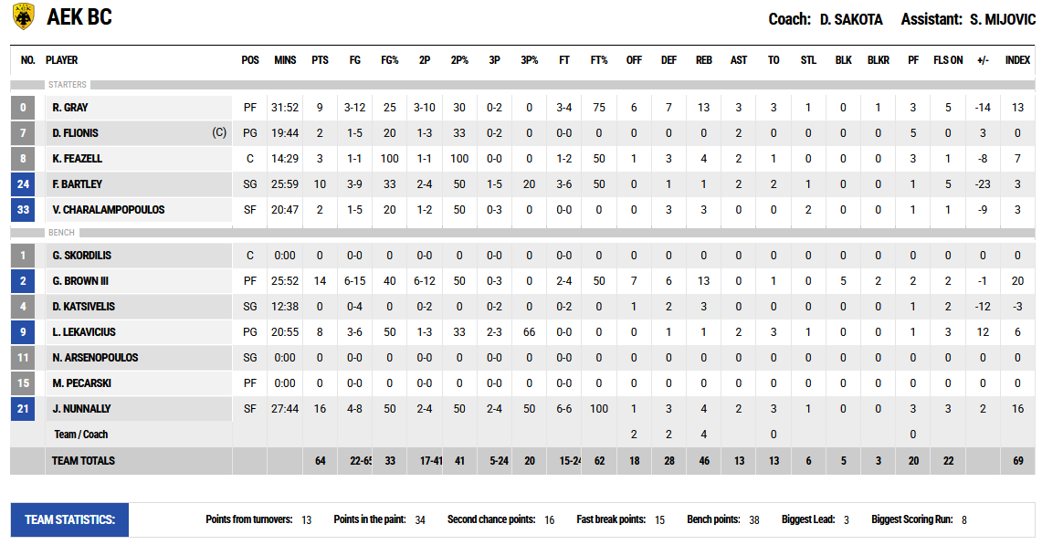 Κορυφαίος της αναμέτρησης ήταν ο Φαν Τούμπεργκεν με 19 πόντους και 9 ριμπάουντ ενώ 16 πόντους είχε ο Χάρις. Για τον ΑΕΚ ο Νάναλι με 16 πόντους, 4 ριμπάουντ και 2 ασίστ ήταν αυτός που ξεχώρισε μαζί με τον Μπράουντ που είχε 14 πόντους, 13 ριμπάουντ και 5 τάπες.