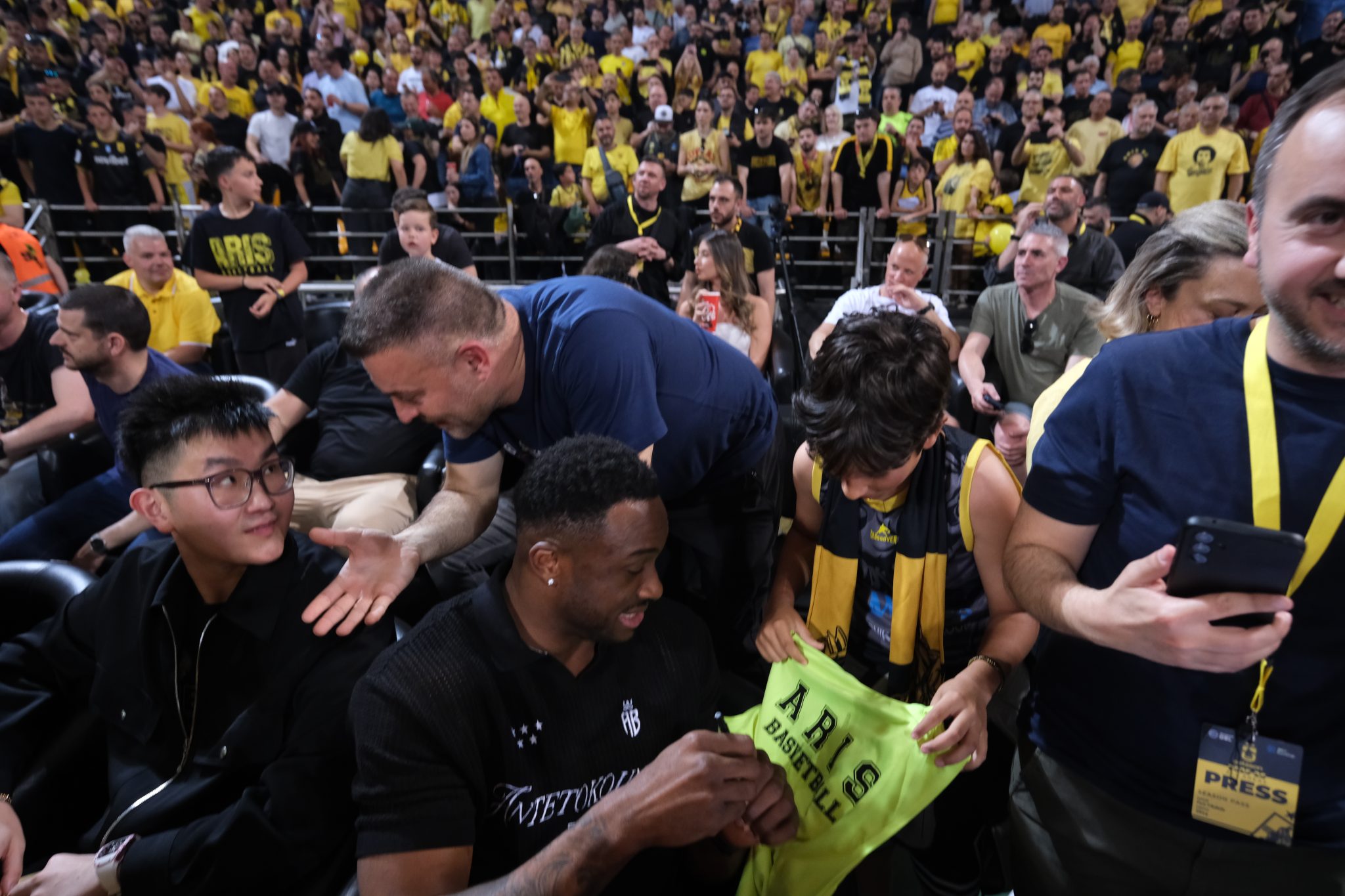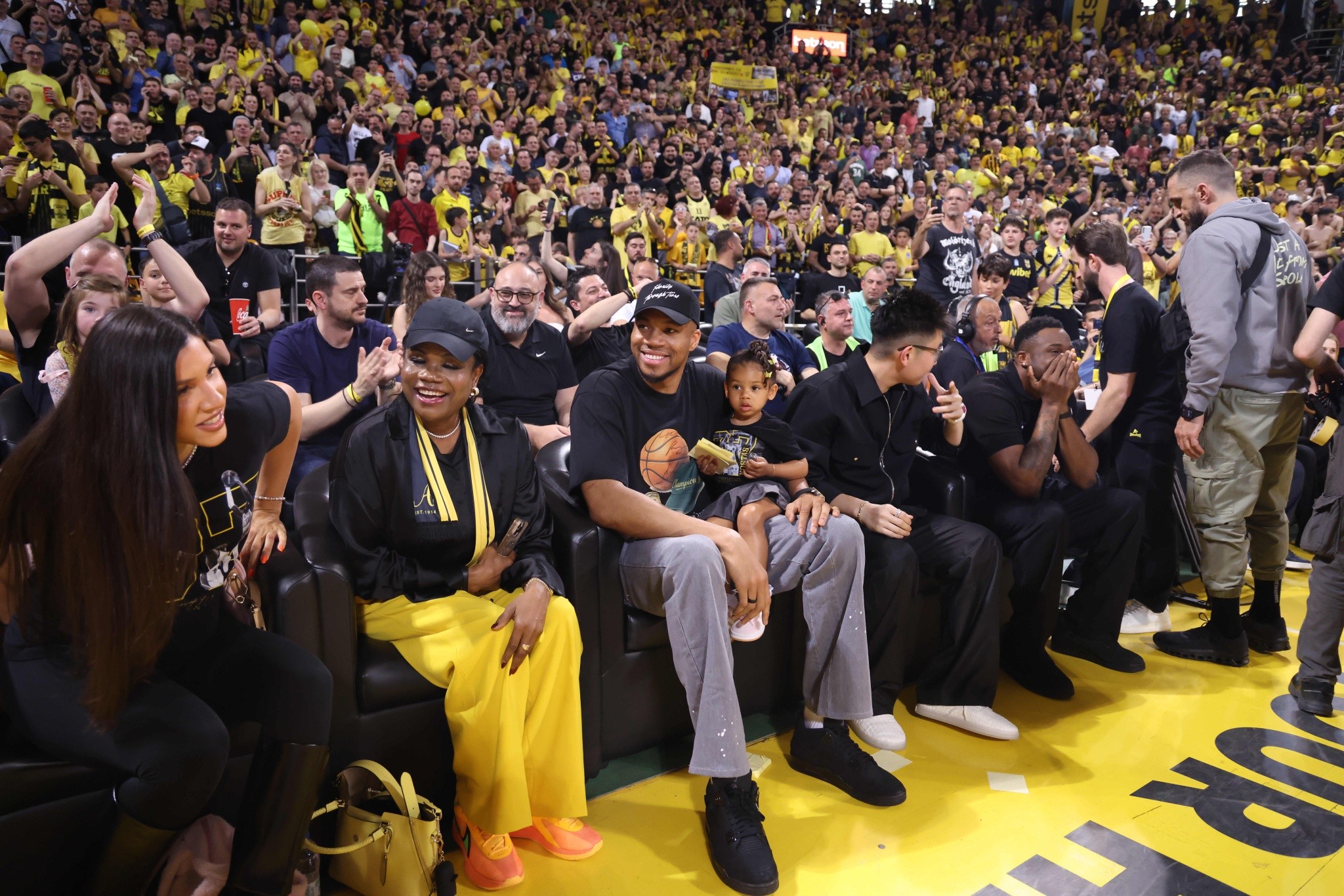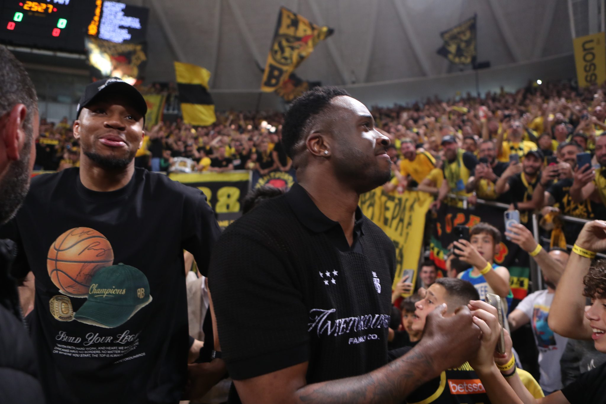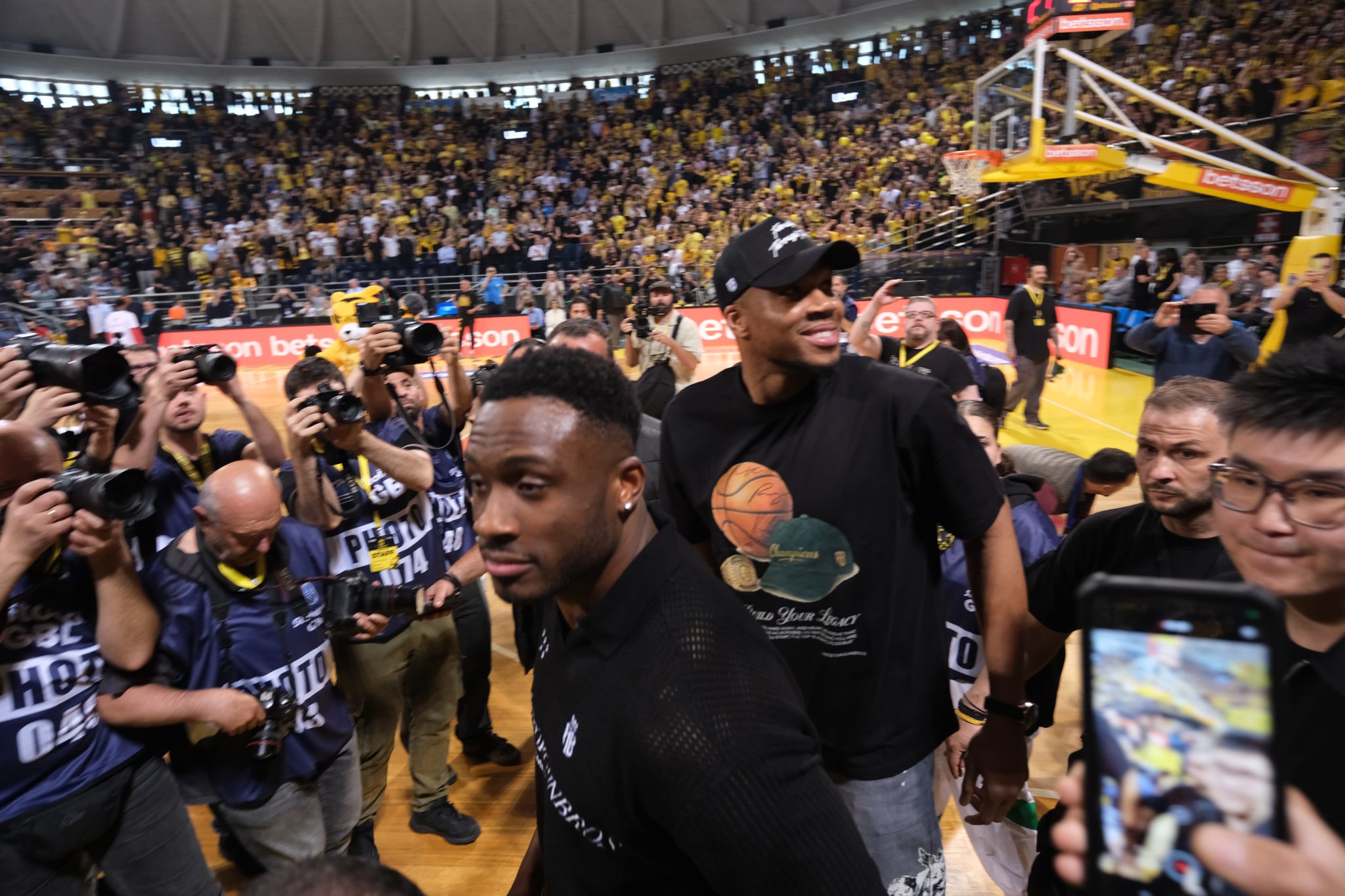 Από κοντά η Θανάσης Αντετοκούνμπο πάντα με το χαμόγελο και την αισιοδοξία που τον διακρίνει και τη μητέρα του Βερόνικα να απαθανατίζει της μεγαλειώδεις στιγμές που έζησαν οι τρεις γιοι της (ο Κώστας από το παρκέ ως αθλητής του Άρη) στο θρυλικό Nick Galis Hall.