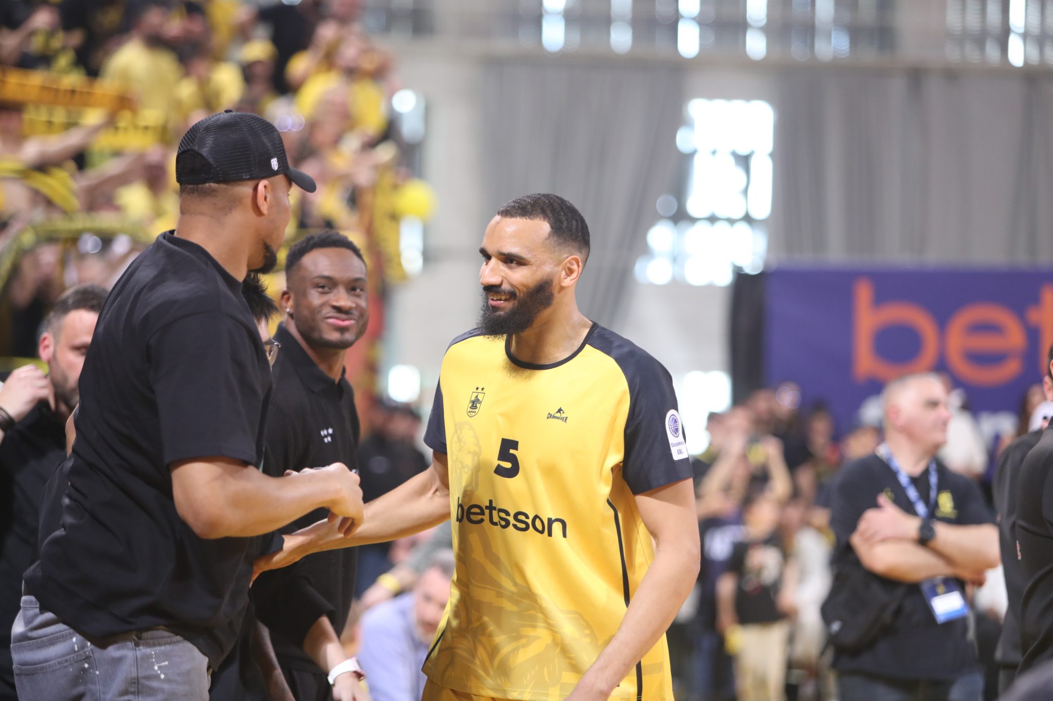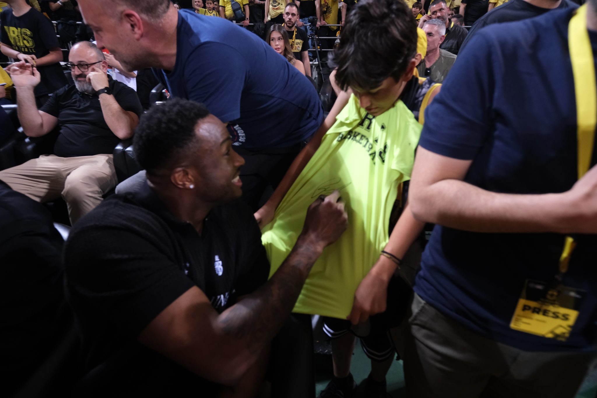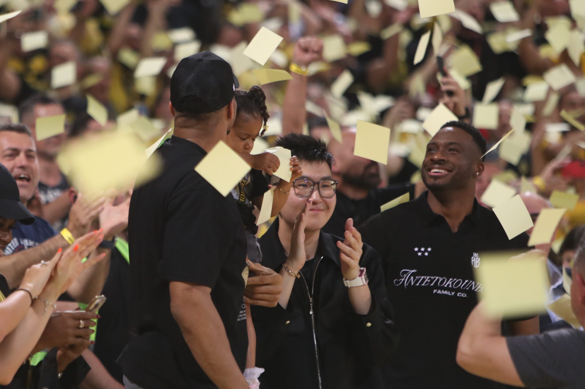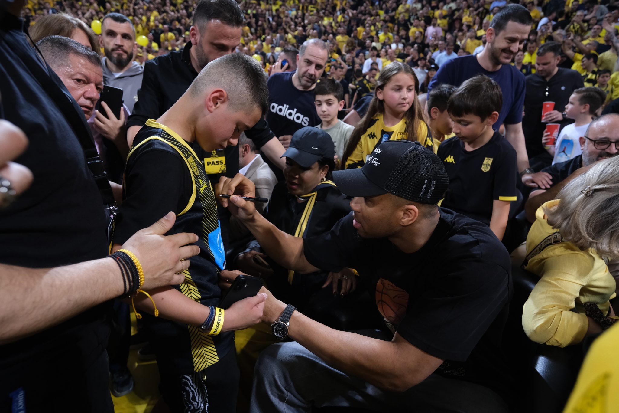 Από κοντά η Θανάσης Αντετοκούνμπο πάντα με το χαμόγελο και την αισιοδοξία που τον διακρίνει και τη μητέρα του Βερόνικα να απαθανατίζει της μεγαλειώδεις στιγμές που έζησαν οι τρεις γιοι της (ο Κώστας από το παρκέ ως αθλητής του Άρη) στο θρυλικό Nick Galis Hall.