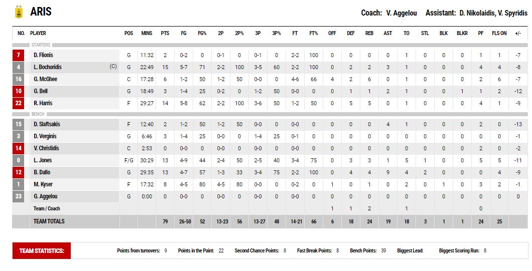 Για τον Αρη οι Μποχωρίδης (15π.), Τζόουνς (13π.) και Νταλό (13π. 9ας) διακρίθηκαν.