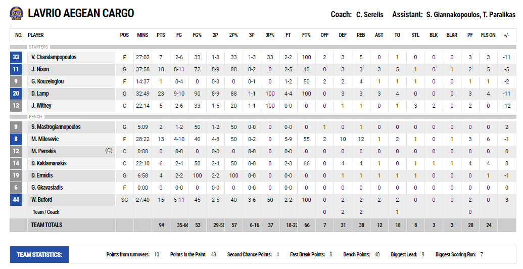 Το… ξενέρωμα της ΑΕΚ από το μπάζερ μπίτερ του Ράις στο ΟΑΚΑ, που σήμανε και τον αποκλεισμό της από το Final 4 του Basketball Champions League ήταν φανερό στα πρώτα λεπτά του παιχνιδιού στο Λαύριο. Ο Ουίθι με τον Ντίξον σκόραραν για το 19-14 των γηπεδούχων, ενώ ο Τζέιμς έριξε τη διαφορά στον πόντο. Η ΑΕΚ ήταν κακή στην άμυνά της, δέχθηκε 28 πόντους σε ένα δεκάλεπτο και αυτό είχε ως αποτέλεσμα το 28-20 της πρώτης περιόδου.