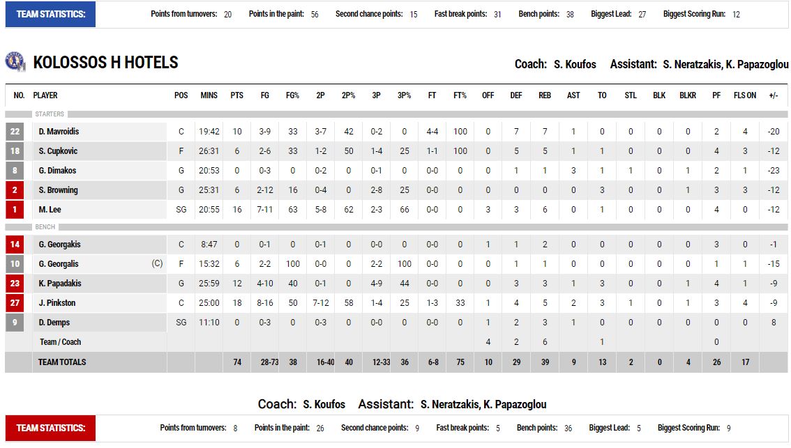 Αναφορικά με το παιχνίδι, ο Κολοσσός ήταν ανταγωνιστικός για κάτι παραπάνω από ένα δεκάλεπτο, όμως με τους Μιλουτίνοφ και Βεζένκοφ σε καλή μέρα (18 και 17 πόντους), η ομάδα του Πειραιά είχε ένα εύκολο απόγευμα απέναντι στους Ροδίτες.
