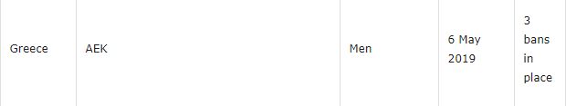 Χαρακτηριστική είναι η εικόνα από την ιστοσελίδα της FIBA που αναφέρει πως η ΑΕΚ βρίσκεται στο στάδιο του τρίτου ban!