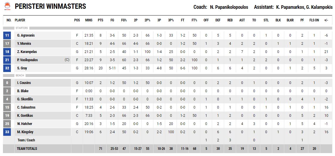 Ο Γκρέι είχε 20 πόντους, 6 ριμπάουντ, 4 ασίστ, ήταν μια ομάδα μόνος του. Μπορεί κανείς άλλος να μην ήταν διψήφιος, αλλά οι γηπεδούχοι είχαν τρεις παίκτες στις παρυφές του 10, με τον Αγραβάνη να πετυχαίνει 8 πόντους και να μαζεύει 5 ριμπάουντ, τον Μορέιρα να είναι οικονομικός, τον Καράμπελα στο καλύτερο φετινό του παιχνίδι να μοιράζει 7 ασίστ και να πετυχαίνει 5 πόντους, τον Κίνγκσλεϊ να έχει 6 πόντους κι άλλα τόσα ριμπάουντ.
