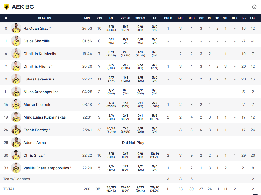 Ο Μπάρτλεϊ ήταν ο κορυφαίος των «κιτρινόμαυρων» με 23 πόντους, 3 ριμπάουντ και 4 ασίστ ενώ 16 πόντους με 9 ριμπάουντ είχε ο Σίλβα. Για τη Ρίγα πρώτος σκόρερ ήταν ο Κλιπς με 14 πόντους ενώ 13 είχε ο Σιντόροφ και 12 ο Νοβίτσκι.
