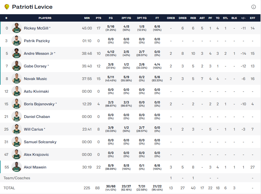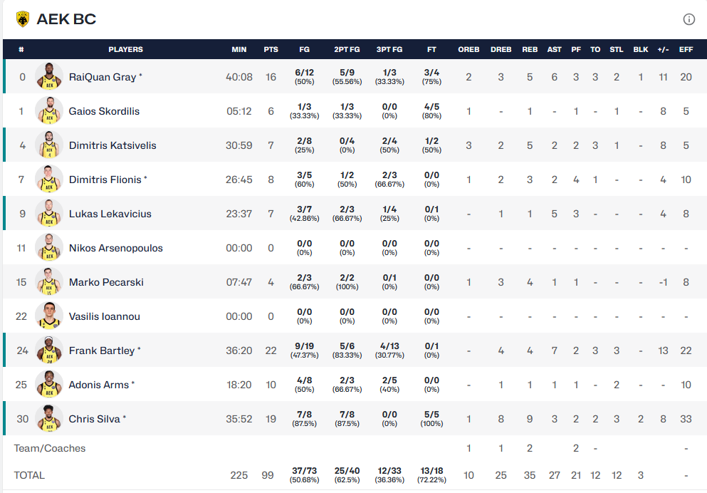 Κορυφαίος για την ΑΕΚ ήταν ο Μπάρτλεϊ με 22 πόντους, 7 ασίστ και 4 ριμπάουντ ενώ 19 πόντους με 3 ασίστ και 9 ριμπάουντ είχε ο Σίλβα. Από κοντά και ο Γκρέι με 6 ασίστ και 5 ριμπάουντ. Για τη Λέβιτσε, ξεχώρισε ο Μαγουέιν με 22 πόντους.