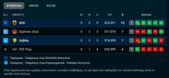 Η βαθμολογία του ομίλου της ΑΕΚ: