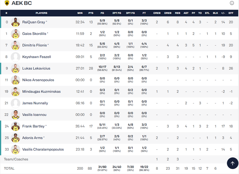 Ο Λιθουανός πραγματοποίησε την κορυφαία του εμφάνιση με τα κιτρινόμαυρα έχοντας 28 πόντους και 4 ριμπάουντ. Διψήφιος ήταν και ο Μπάρτλεϊ με 17 πόντους, ο Φλιώνης με 15 και ο Γκρέι με 13 ενώ ντεμπούτο έκαναν οι Νάναλι, Φίζελ. Για την Καρδίτσα κορυφαίοι ήταν οι δύο Τζέφερσον. Ο Μπράντον είχε 19 πόντους και ο Ντάμιεν 17.