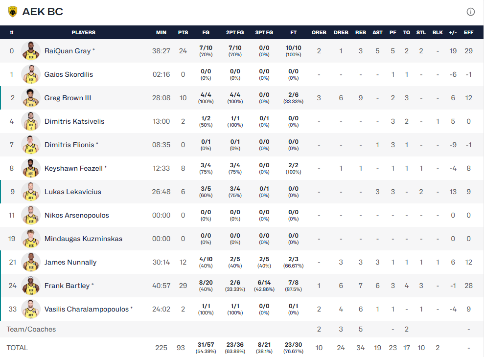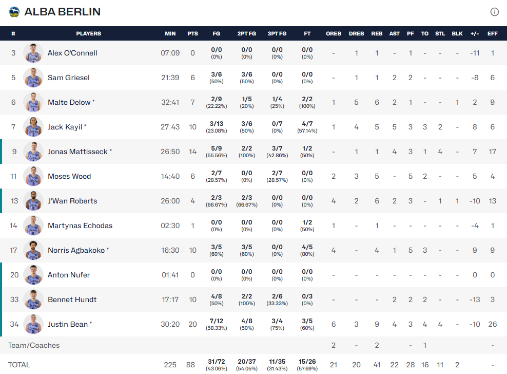 Κορυφαίος για τους «κιτρινόμαυρους» ήταν ο Μπάρτλεϊ με 29 πόντους, 7 ριμπάουντ και 6 ασίστ ενώ 24 πόντους με 3 ριμπάουντ και 5 ασίστ είχε ο Γκρέι. Για την Άλμπα ξεχώρισε ο Μπιν που σταμάτησε στους 20 πόντους με 9 ριμπάουντ και 4 ασίστ.