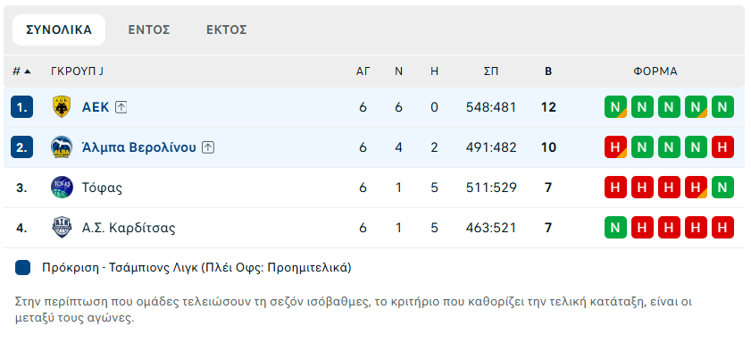 Πρώτη και αήττητη η ΑΕΚ στα προημιτελικά του BCL! Η Ένωση είχε περιθώριο ακόμη και για ήττα ως και οκτώ πόντους στο Βερολίνο, ωστόσο παρότι το έκανε θρίλερ στο τέλος της κανονικής διάρκειας (79-79) πήρε τη νίκη επί της Άλμπα με 93-88 για την έκτη και τελευταία αγωνιστική του Champions League μπροστά σε περίπου 400 οπαδούς της.
