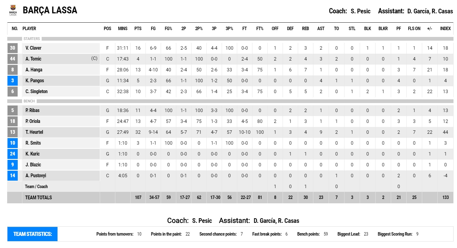 Όπως προαναφέραμε, μεγάλος πρωταγωνιστής στη νίκη της Μπαρτσελόνα ήταν ο Τόμας Ερτέλ. Ο γκαρντ των Καταλανών ολοκλήρωσε την αναμέτρηση με 32 πόντους και 9 ασίστ, ενώ από κοντά ακολούθησαν οι Κλαβέρ και Οριόλα με 16 και 13 πόντους, αντίστοιχα. Για τους ηττημένους ξεχώρισε ο Νίκολας Λαπροβίτολα, ο οποίος είχε 22 πόντους και 11 ασίστ.