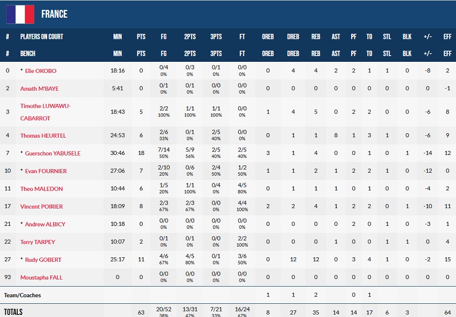 Από την πλευρά των ηττημένων ο Γκερσόν Γιαμπουσελέ σημείωσε 18 πόντους, με τον Ρούντι Γκομπέρ να προσθέτει 11 πόντους και 12 ριμπάουντ, σε μίαα βραδιά που οι «τρικολόρ» είχαν 14 ασίστ και 17 λάθη.