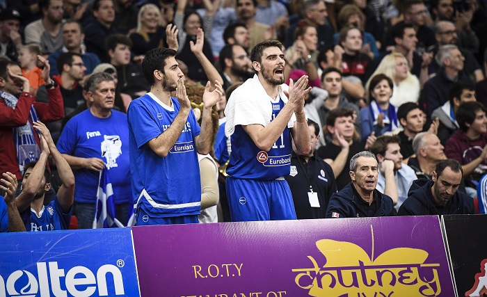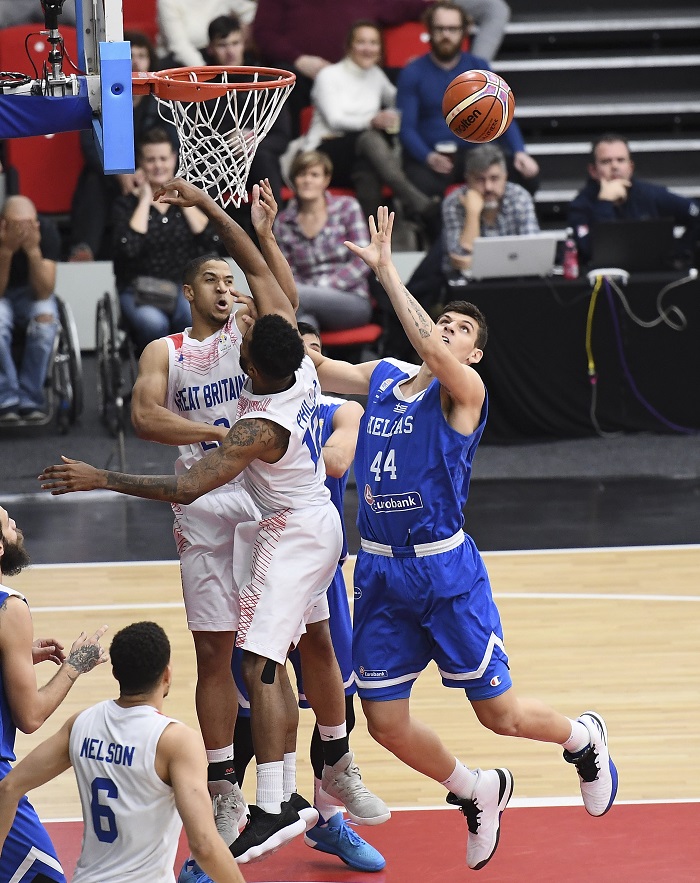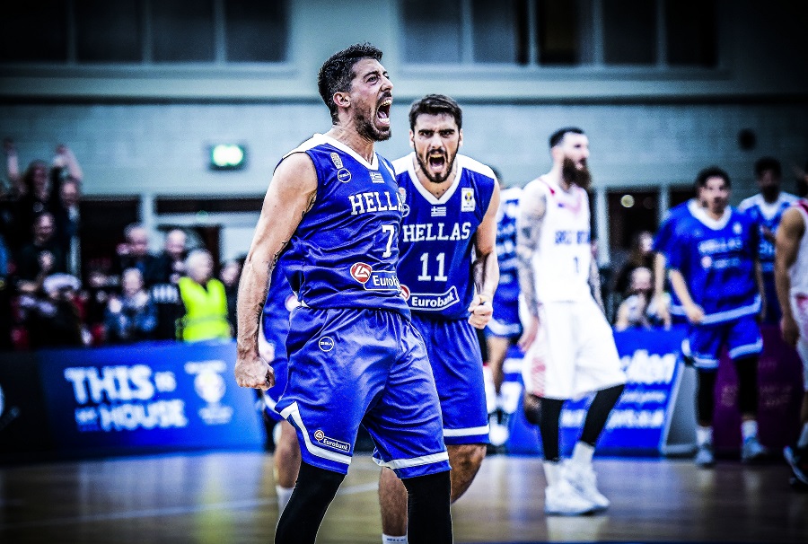 Εκρηξη συναισθημάτων για τους Ελληνες διεθνείς και τον Θανάση Σκουρτόπουλο στο μεγάλο τρίποντο του Γιάννη Αθηναίου κόντρα στη Μεγάλη Βρετανία.