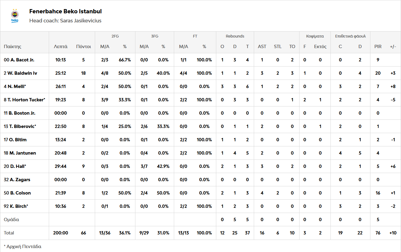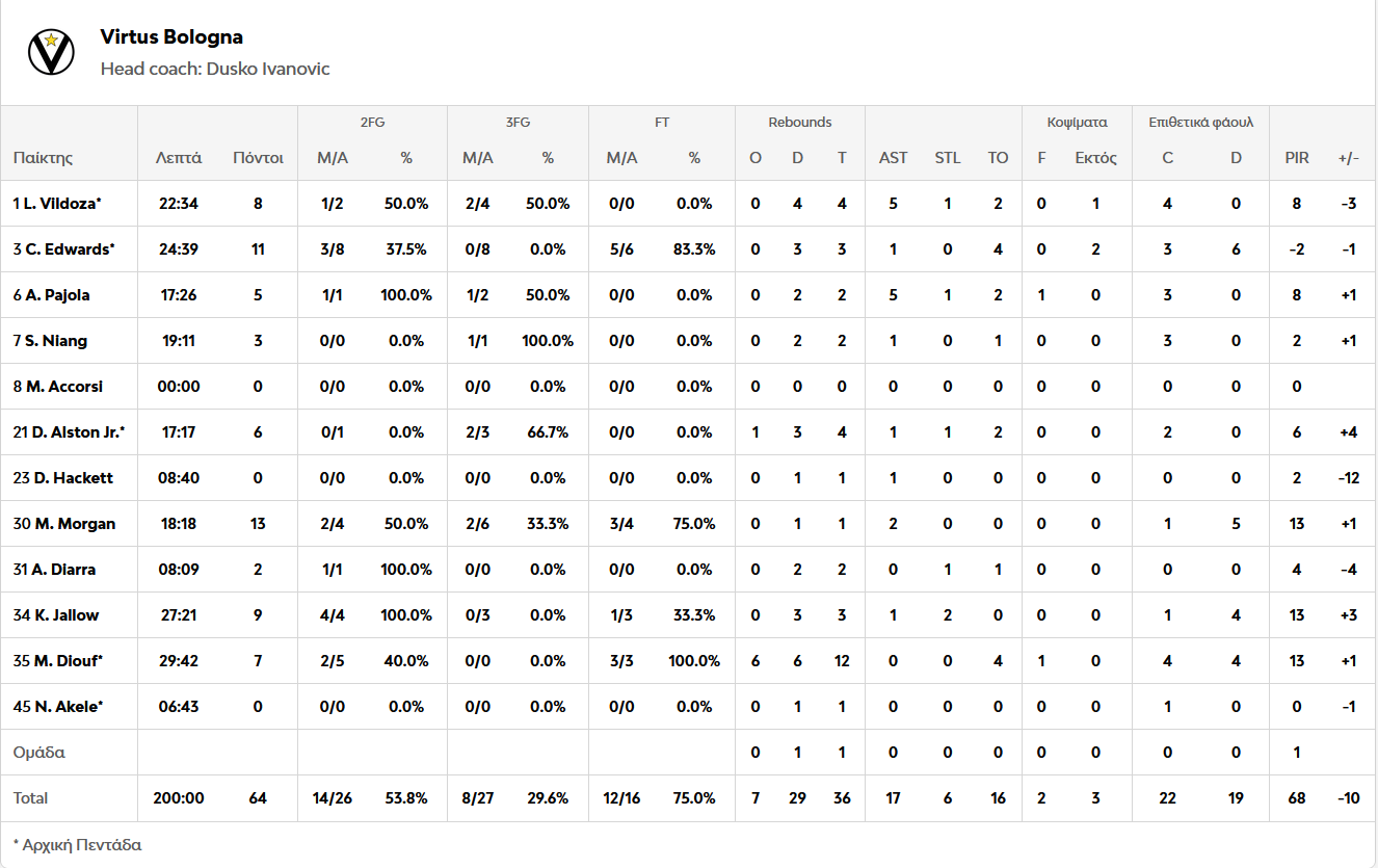 Κορυφαίος για την ομάδα του Σαρούνας Γιασικεβίτσιους ήταν ο Μπόλντουϊν με 18 πόντους ενώ ακολούθησε ο Κόλσον με 8 πόντους και 4 ασίστ. Πρώτος σκόρερ της Βίρτους ήταν ο Μόργκαν με 13 πόντους.
