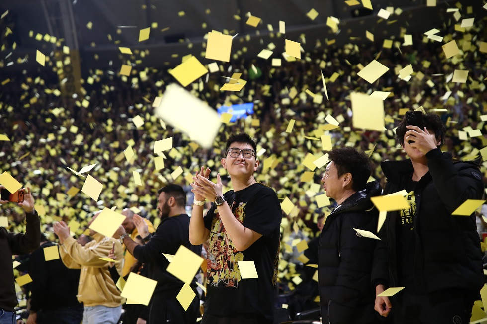 Ο νεαρός Ασιάτης επιχειρηματίας έδειχνε για μία ακόμη φορά να απολαμβάνει κάθε στιγμή του στο Nick Galis Hall ενώ συμμετείχε σε κάθε στιγμή του αγώνα με τις έντονες εκδηλώσεις του. Μία από τις πιο ξεχωριστές στιγμές φυσικά ήταν όταν ο «ουρανός» του Παλέ «κιτρίνισε» από τα χιλιάδες χαρτάκια που πέταξε ο κόσμος του Άρη με το τζάμπολ, όπως γίνεται σε κάθε σημαντικό παιχνίδι.