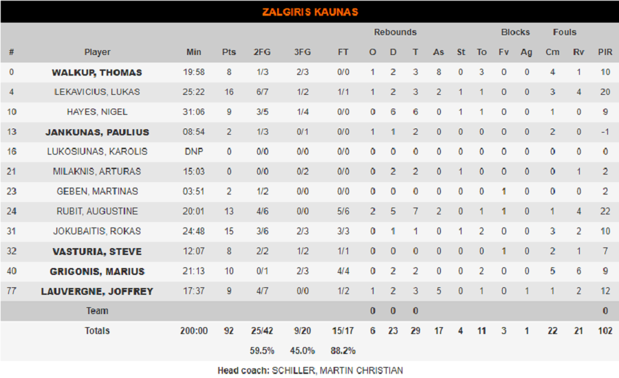 Κορυφαίοι για τους νικητές ήταν οι Πάντερ (22π.) και ΛεΝτέι (20π.) ενώ για τους ηττημένους ξεχώρισαν οι Λεκαβίτσιους (16π.) και Γιοκουμπάιτις (15π.).