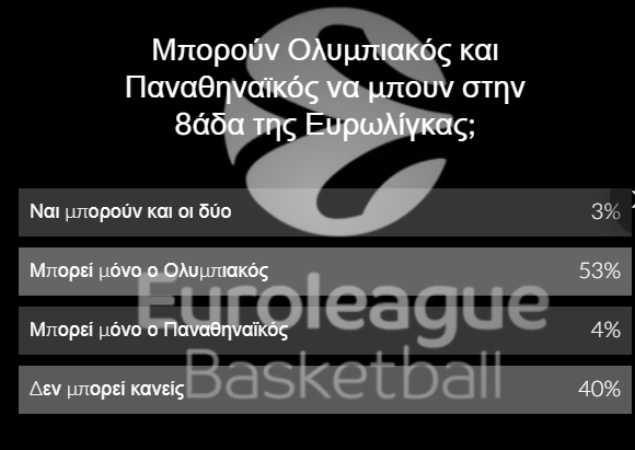 Με συντριπτικό ποσοστό της τάξεως του 53% ψηφίσατε πως μόνο ο Ολυμπιακός μπορεί να προκριθεί στα πλέι-οφ της Ευρωλίγκας, σε αντίθεση με τον Παναθηναϊκό.