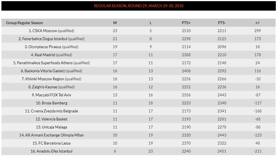 Μετά την ολοκλήρωση του πρώτου μισού της 29ης αγωνιστικής της Ευρωλίγκας, έγιναν γνωστές οι οκτώ ομάδες που θα συμμετάσχουν στα προημιτελικά του θεσμού. «Αγκαλιά» με τη 2η θέση η Φενέρ, για «σταύρωμα» με τη Μπασκόνια πάει ο Ολυμπιακός στα πλέι οφ.