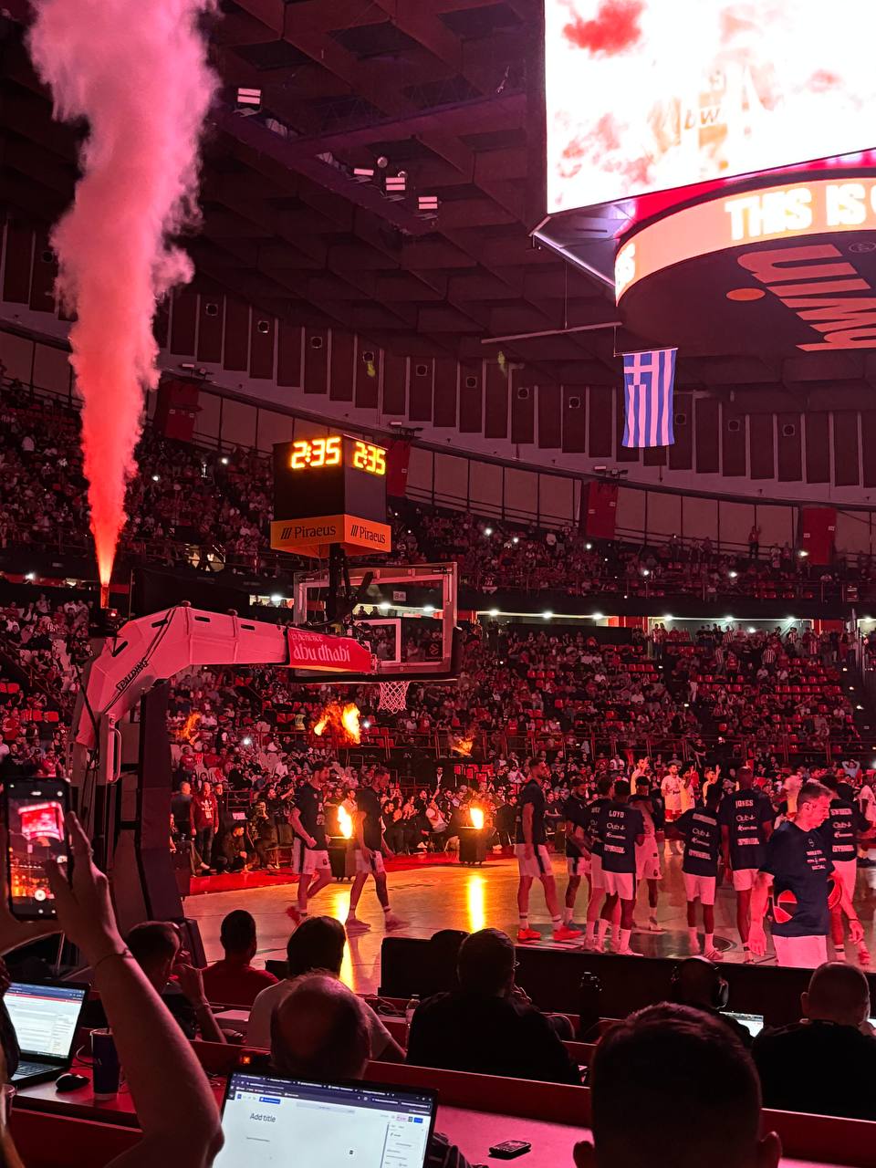 Η παρουσίαση του Ολυμπιακού για το ματς με την Εφές ολοκληρώθηκε. Λίγο πριν από την έναρξη προβλήθηκε ένα βίντεο με τις καλύτερες στιγμές από την περυσινή σεζόν, ενώ κατά τη διάρκεια της διαδικασίας υπήρχαν θεαματικά εφέ με φωτιές, μόλις γινόταν η ανάκρουση του ονόματος του κάθε παίκτη.