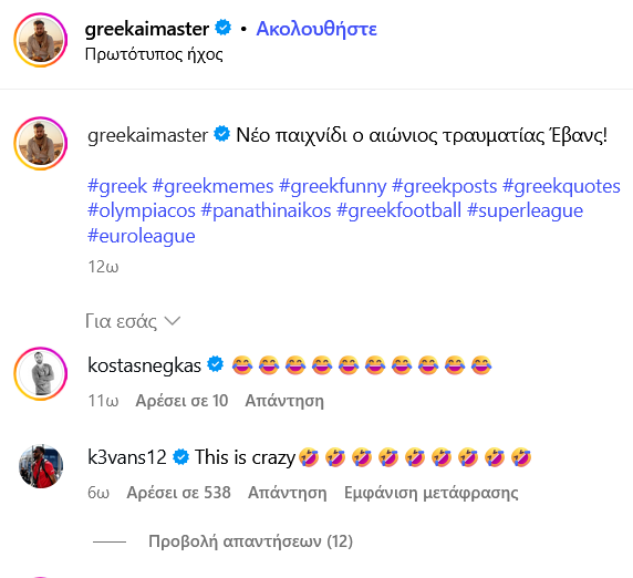 Ειδικά το δεύτερο το απέδειξε μέσω των social media. Και εξηγούμαστε. Το απόγευμα της Κυριακής (2/11) η σελίδα «Greek AI Master» στο Instagram, η οποία συνηθίζει να ανεβάζει χιουμοριστικά βίντεο με Τεχνητή Νοημοσύνη για θέματα της επικαιρότητας όπως η πολιτική, ο αθλητισμός κλπ, έκανε ανάρτηση για τον «αιώνιο τραυματία Έβανς», όπως αναφέρθηκε χαρακτηριστικά.