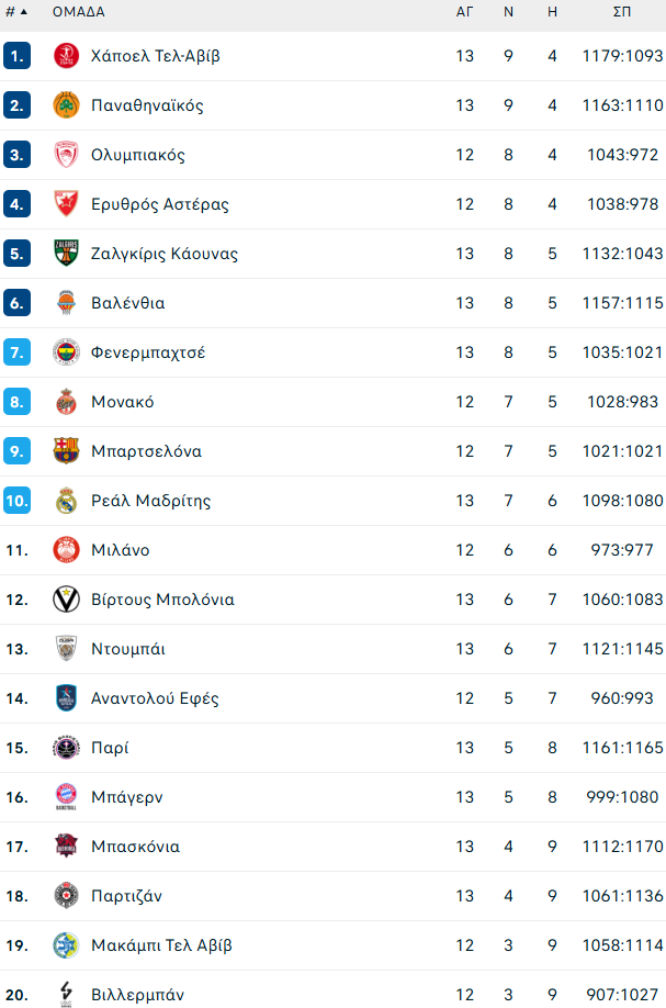 Δείτε πώς έχει διαμορφωθεί η βαθμολογία της Euroleague μετά τη νίκη του Παναθηναϊκού επί της Παρτίζαν