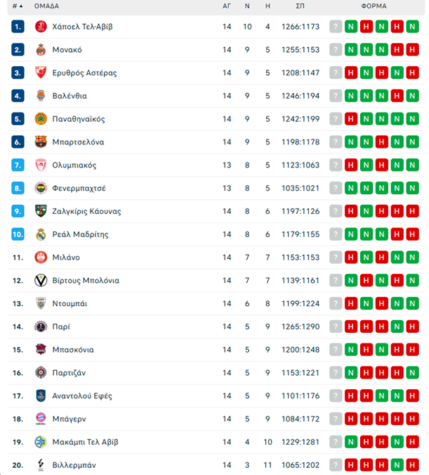 Δείτε πώς διαμορφώθηκε η βαθμολογία της Euroleague μετά την ήττα του Παναθηναϊκού από τη Βαλένθια και την ολοκλήρωση της 14ης αγωνιστικής.