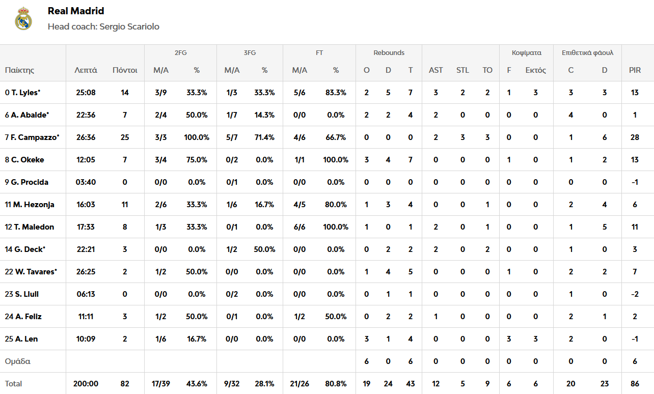 Κορυφαίος των νικητών ήταν ο Μάρκο Γκούντουριτς με 22 πόντους, ενώ από τη Ρεάλ, που προερχόταν από σερί τεσσάρων νικών, δεν αρκούσαν οι 25 πόντοι του Φακούντο Καμπάτσο.