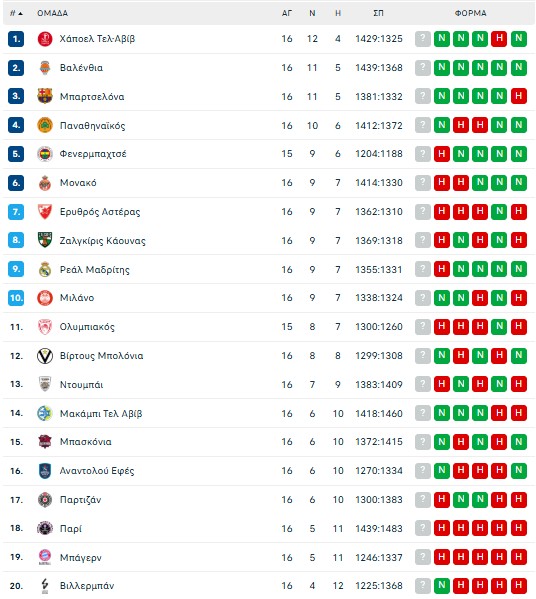 Δείτε πως έχει διαμορφωθεί η βαθμολογία της Euroleague μετά την ολοκλήρωση της 16ης αγωνιστικής.