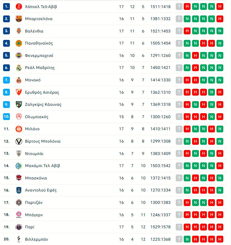 Οι Πράσινοι βρίσκονται πλέον στην τέταρτη θέση, μετρώντας 11 νίκες και 6 ήττες. Πρώτη παραμένει η Χάποελ και ακολουθεί η Μπαρτσελόνα, με τη Βαλένθια να συμπληρώνει την πρώτη τριάδα.