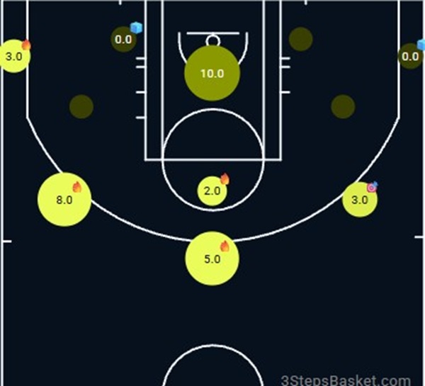 Τα εύστοχα καλάθια του Φουρνιέ στα τελευταία έξι ματς. (όσο μεγαλύτερο ο κύκλος, τόσο περισσότερες οι προσπάθειες)