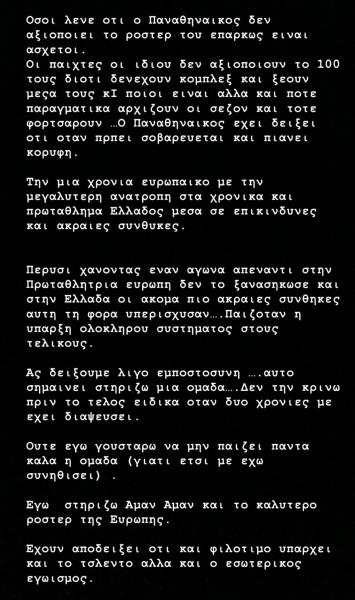 Οι παίχτες οι ίδιοι δεν αξιοποιούν το 100% τους διότι δεν έχουν κόμπλεξ και ξέρουν μέσα τους και ποιοι είναι αλλά και πότε πραγματικά αρχίζει η σεζόν και τότε φορτσάρουν …Ο Παναθηναικός έχει δείξει ότι όταν πρέπει σοβαρεύεται και πιάνει κορυφή.