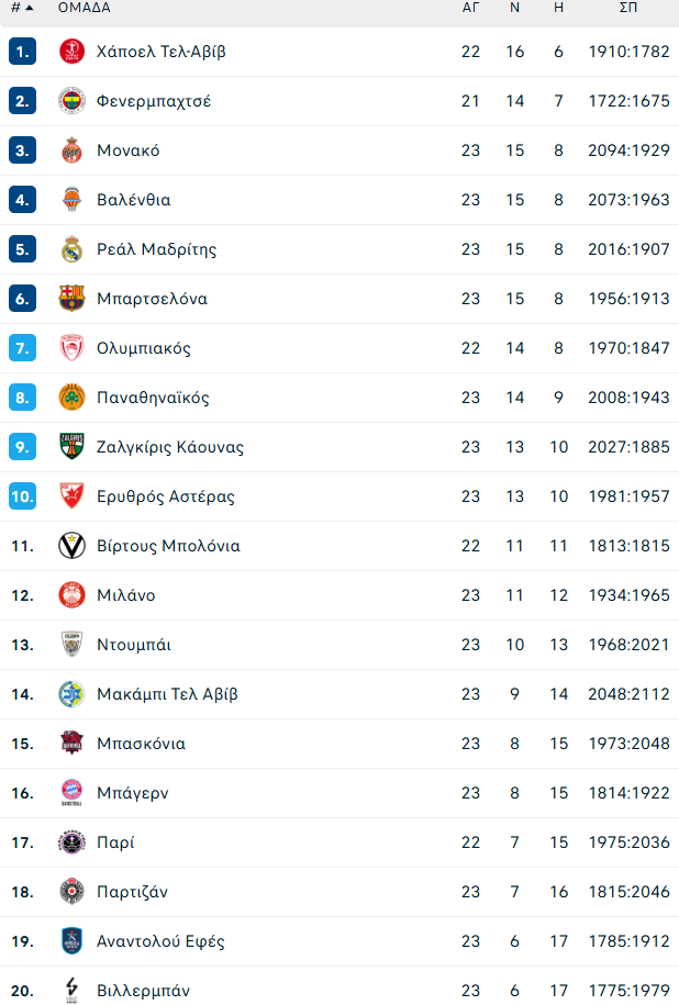Δείτε πώς διαμορφώθηκε η βαθμολογία της Euroleague μετά τις νίκες των δύο ελληνικών ομάδων