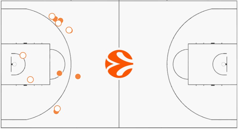Το shot chart του Βασίλη Τολιόπουλου. Με πορτοκαλί τα εύστοχα, με λευκό τα άστοχα σουτ.