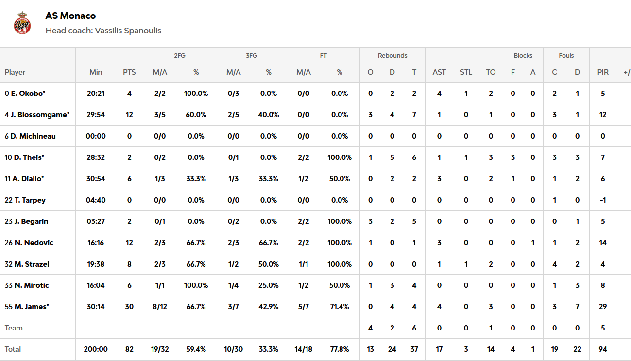 Η διαφορά κυμάνθηκε πέριξ των 10 πόντων, με τον Αϊζέια Μάικ να γράφει με τρίποντο το 79-67 πέντε λεπτά πριν από το τέλος και να διαμορφώνει προβάδισμα +12 που αποδείχθηκε αρκετό για τους γηπεδούχους. Ο Ομπστ πέτυχε 19 πόντους με 5/11 τρίποντα, ο Μάικ είχε 12 και ο Γκέιμπριελ 10π, 8ρ., για τη Μπάγερν που βρήκε σκορ και από τους 11 παίκτες που χρησιμοποίησε ο Σβέτισλαβ Πέσιτς. Η Μονακό είχε έναν Τζέιμς… απ΄τα παλιά με 30π., 4ρ., 4ασ., αλλά ήταν μόνος…