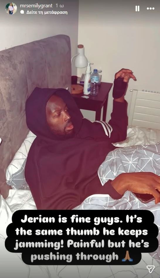 Η σύζυγος του Γκραντ πλαισίωσε το story με μία φωτογραφία του παίκτη των Πράσινων, στην οποία απεικονίζεται να φοράει προστατευτικό στο χέρι.