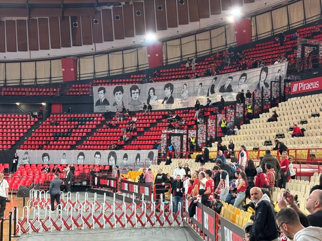 Πριν από το τζάμπολ της αναμέτρησης με την Βίρτους Μπολόνια για την 27η αγωνιστική της Euroleague, οι φίλοι του Ολυμπιακού σήκωσαν το καθιερωμένο πανό με τα ονόματα των 21 θυμάτων.